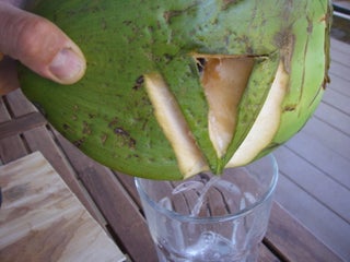 Theres some delicious jelly lining the inside of the nut. Take a hammer and whack along the equator line with swift hard hitskeeping the fingers of the hand holding the coconut well out of the way. Make a hole and pour the juice into a glass.