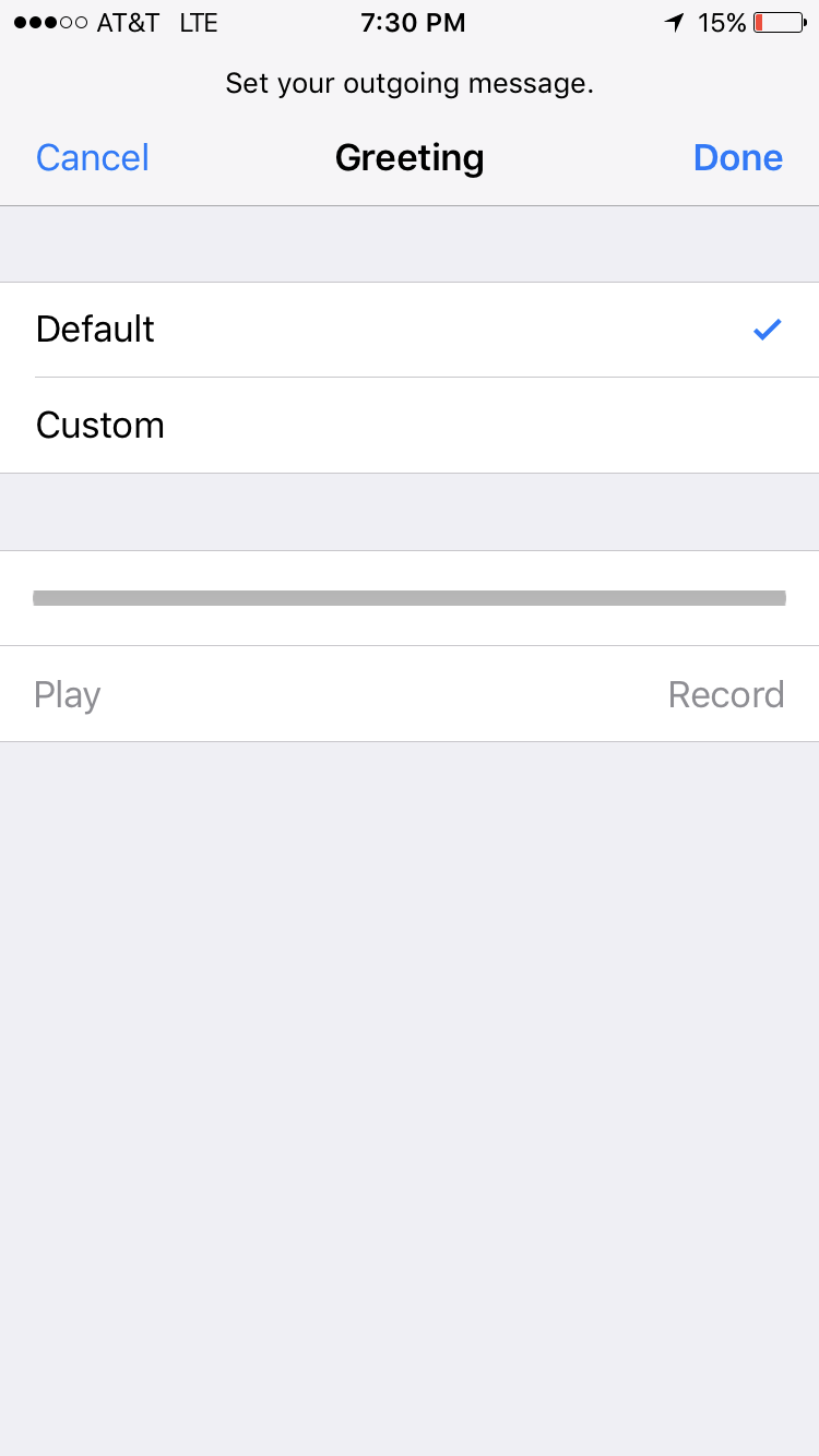 If you have more than one cellular plan on your iPhone try switching to the other plan. In the Greeting screen tap Custom. Nowhere in the voice greeting menu does it say to reset your greeting to default press ___ I dont want to record a new one.